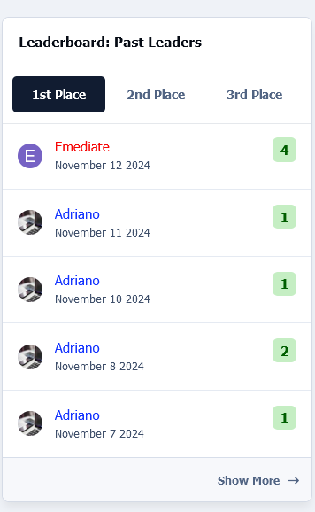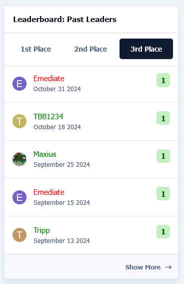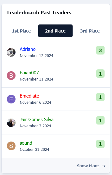 Показывает, какие участники завоевали наибольшую репутацию или лайки за последние несколько дней.