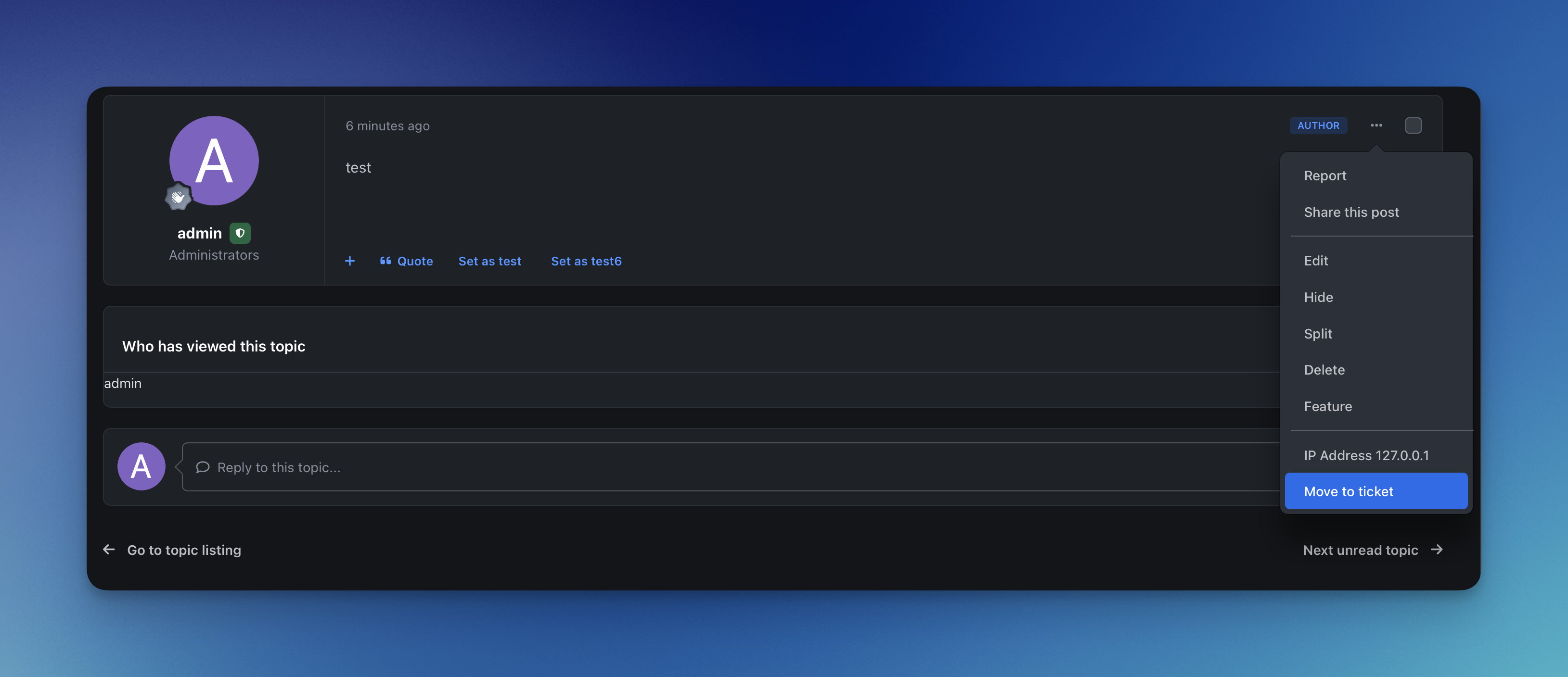 This application is the first extension for our Support Ticket System, allowing moderators with permissions to view tickets, to create a new ticket from existing posts.